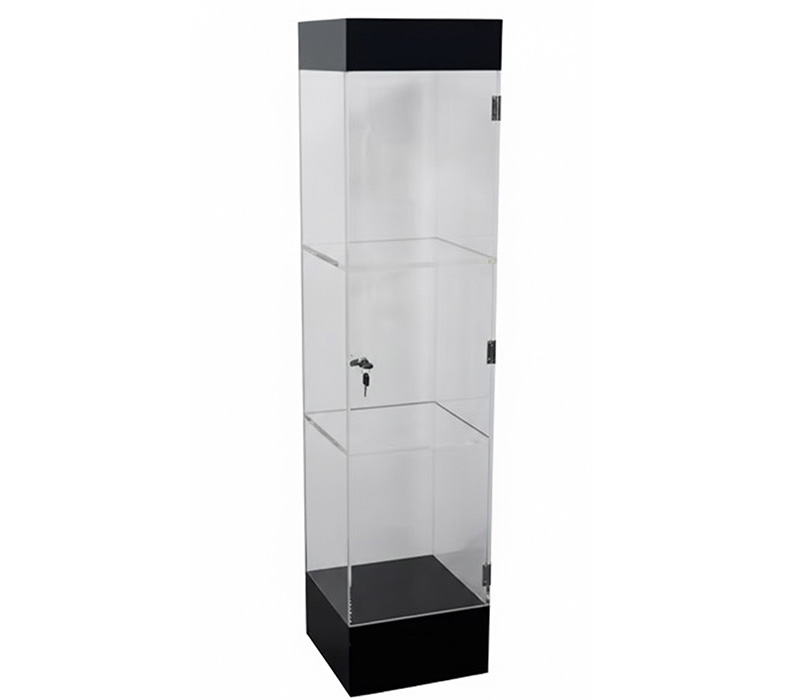 Custom acrylic 3-tier lockable LED display cabinet with sleek black top and base, designed to securely showcase collectibles. Integrated LED lighting highlights each tier, while clear acrylic panels protect items from dust and provide a stylish, professional display.