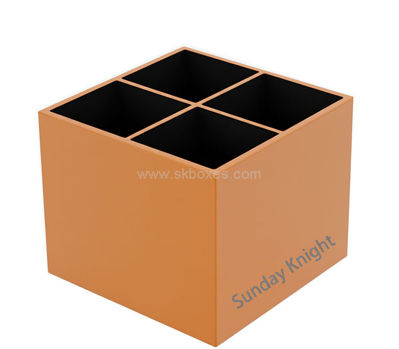 Custom orange and black acrylic writing tools storage box with 4 dividers, perfect for organizing pens, pencils, and office accessories. Built from durable acrylic with a sleek dual-tone finish. Delivered straight to your door with tax paid, offering a convenient and worry-free buying experience every time.