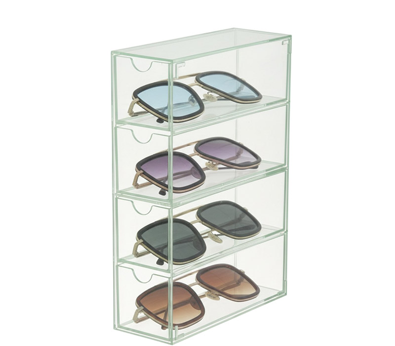 Custom translucent green acrylic 4 tiers sunglasses drawers box crafted for stylish storage and display. Features smooth-sliding drawers, durable acrylic construction, and a modern translucent finish. Ideal for organizing sunglasses in retail stores, boutiques, or at home while keeping eyewear protected, visible, and neatly arranged.
