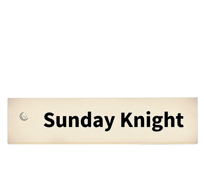 This custom acrylic backlit logo light box features a sleek, minimalist design with a warm, ambient glow. The high-quality acrylic panel showcases the "Sunday Knight" branding and celestial iconography, providing a professional, eye-catching display perfect for modern office interiors or storefronts.