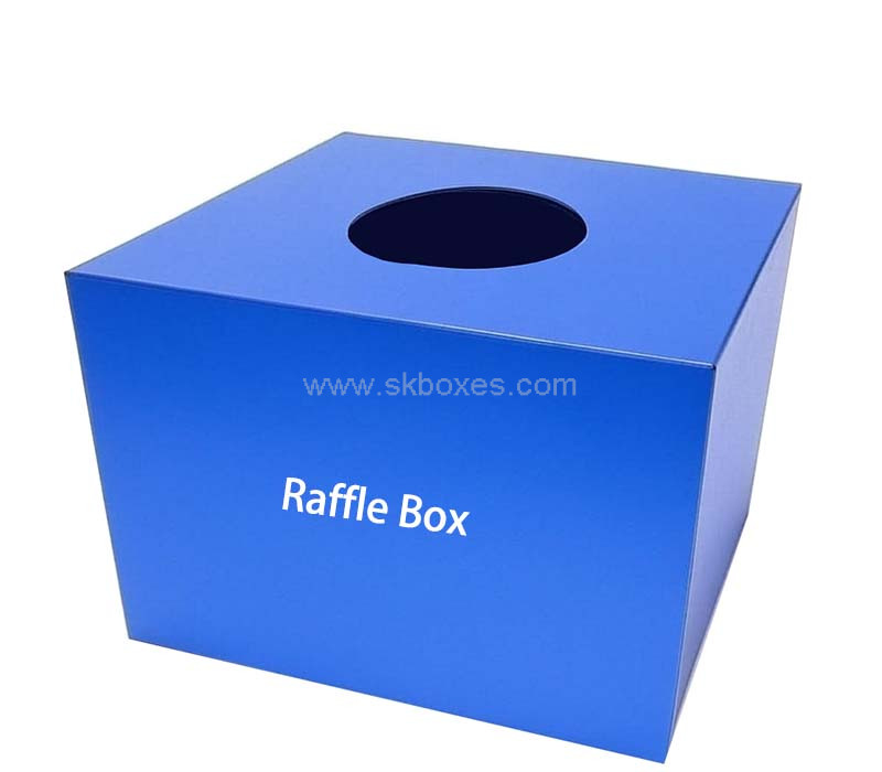 Custom blue acrylic bonus draw box designed for corporate giveaways and promotions. Wholesale only – No extra customs fees in the USA, Europe, UK, and Asia. Durable, stylish, and fully customizable to match your branding needs.