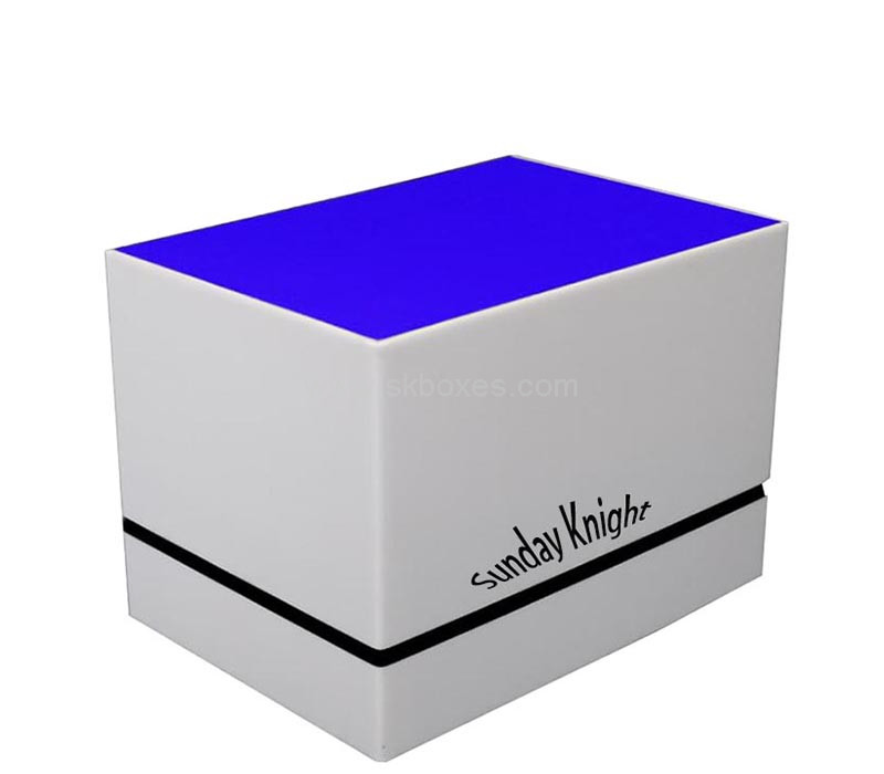 Elevate your brand with this stylish white acrylic storage box, featuring sleek black lines and a striking blue top surface. Perfect for gifts, cosmetics, or luxury retail displays. Durable, modern, and available in bulk—contact us for wholesale pricing!