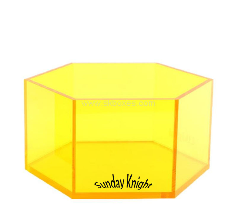 Brighten your retail displays with this eye-catching hexagonal storage box in translucent yellow acrylic. Perfect for organizing cosmetics, jewelry, or small accessories. Modern, durable, and available in bulk—contact us for wholesale pricing today!