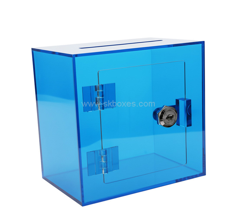 Custom translucent blue acrylic public voting box is produced from high-quality acrylic for long-lasting durability and clear visibility. The semi-transparent blue finish ensures privacy while allowing monitoring. Designed for public spaces, it is ideal for elections, feedback collection, donations, and community events.