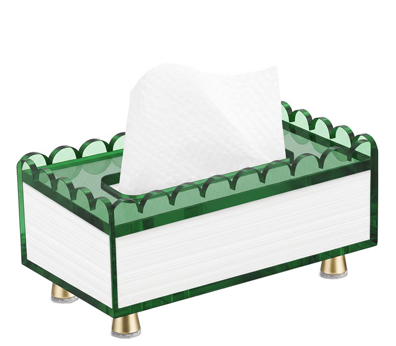 Custom acrylic scalloped tissue box with gold legs features a refined scalloped silhouette in clear and translucent green acrylic for a fresh, elegant look. Elevated by polished gold legs, it keeps tissues clean and accessible while adding a decorative accent to bathrooms, bedrooms, offices, hotels, and luxury retail spaces.