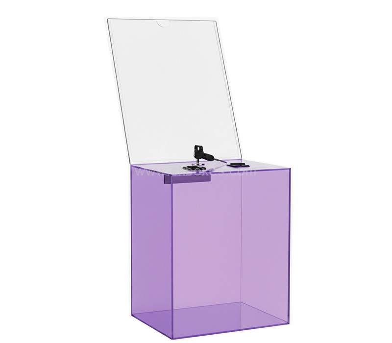 Custom translucent purple acrylic ticket container with sign holder is crafted from premium acrylic for durability and visual appeal. The semi-transparent purple finish adds a modern touch while keeping tickets organized and visible. Integrated sign holder clearly displays labels, pricing, or event information for counters.