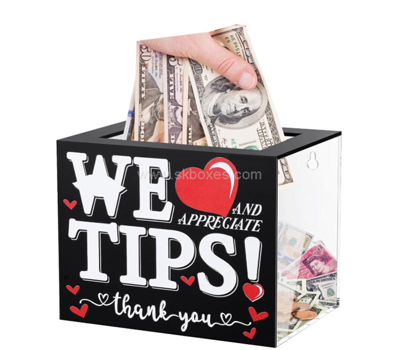 Custom clear and black acrylic tips jar for bartenders, designed for wholesale. Prepaid duties and taxes ensure smooth delivery. Stylish, durable, and perfect for secure tip collection in busy bar settings.