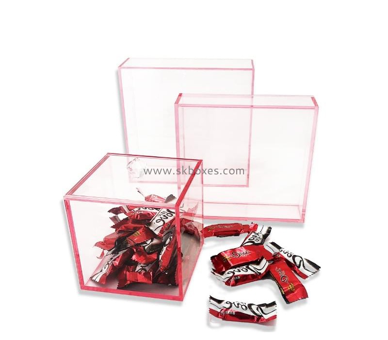 The custom translucent red plexiglass candy box is a delightful and eye-catching container designed to store and present sweets in a unique way. Crafted from high-quality translucent red plexiglass, this candy box offers a captivating blend of vibrant color and see-through appeal, creating an enticing display for candies and treats.