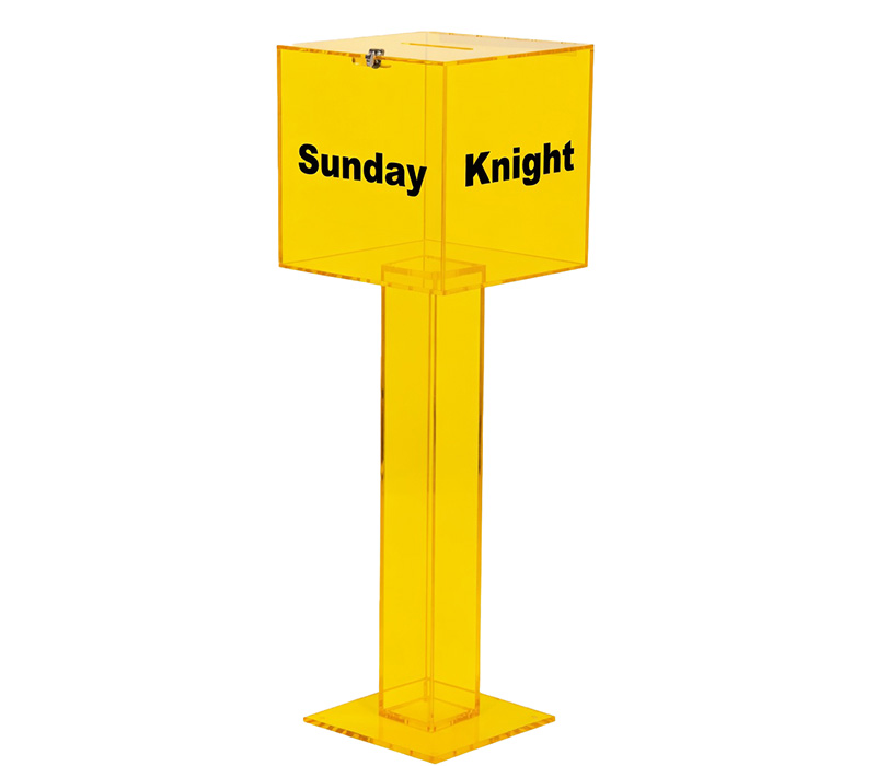 Streamline your polling or feedback collection with this custom plexiglass free-standing ballot box. Built for durability and style, it fits perfectly in any professional environment. Color and shape can be fully customized to your specifications. Available for wholesale only.