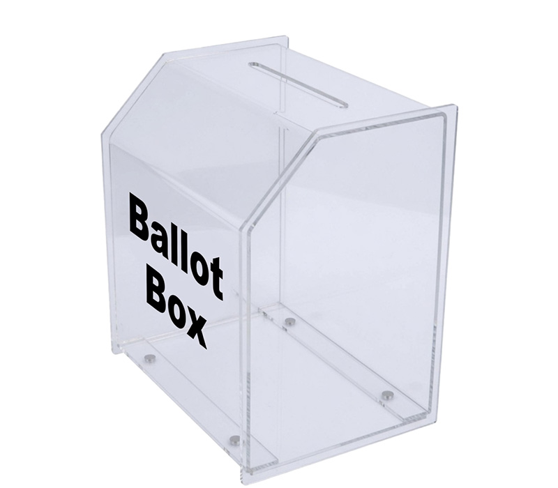 Custom plexiglass house-shaped election vote box. Perfect for ballots, suggestions, and voting events. Fully customizable in color, shape, and size. High-quality transparent acrylic construction. Wholesale orders only.