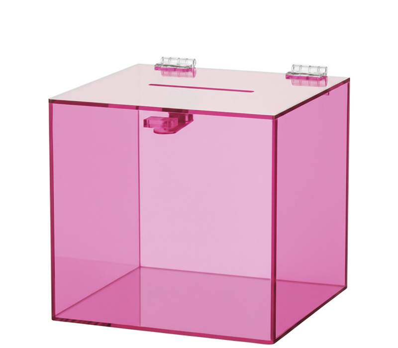 Custom translucent pink plexiglass suggestion collection box, perfect for offices, retail stores, schools, and events. Elegant see-through design builds trust while keeping submissions visible. Features secure lock and smooth slot opening. Durable acrylic construction. Custom sizes, logo printing, and color options available to match your branding.