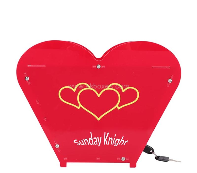 A vibrant wholesale custom red acrylic donation box in a heart shape, ideal for fundraisers and events. Durable and eye-catching, it features an easy-access slot, secure lock, and customizable options, blending functionality with a charming design to inspire generosity.