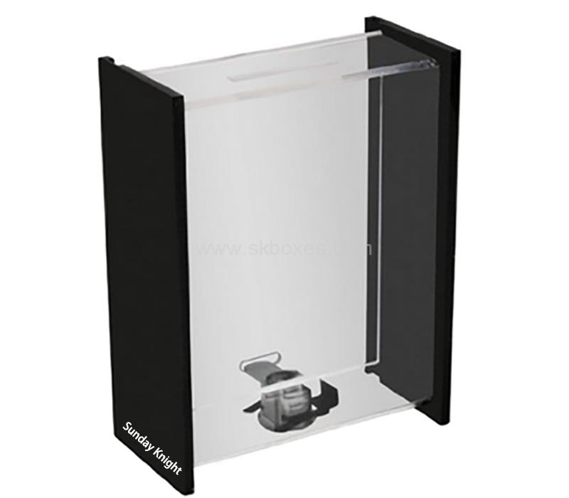 This wholesale custom acrylic lockable ballot box features a sleek black base with a clear top for easy viewing. Designed for secure voting or suggestion purposes, it includes a locking mechanism to ensure the safety and integrity of ballots.