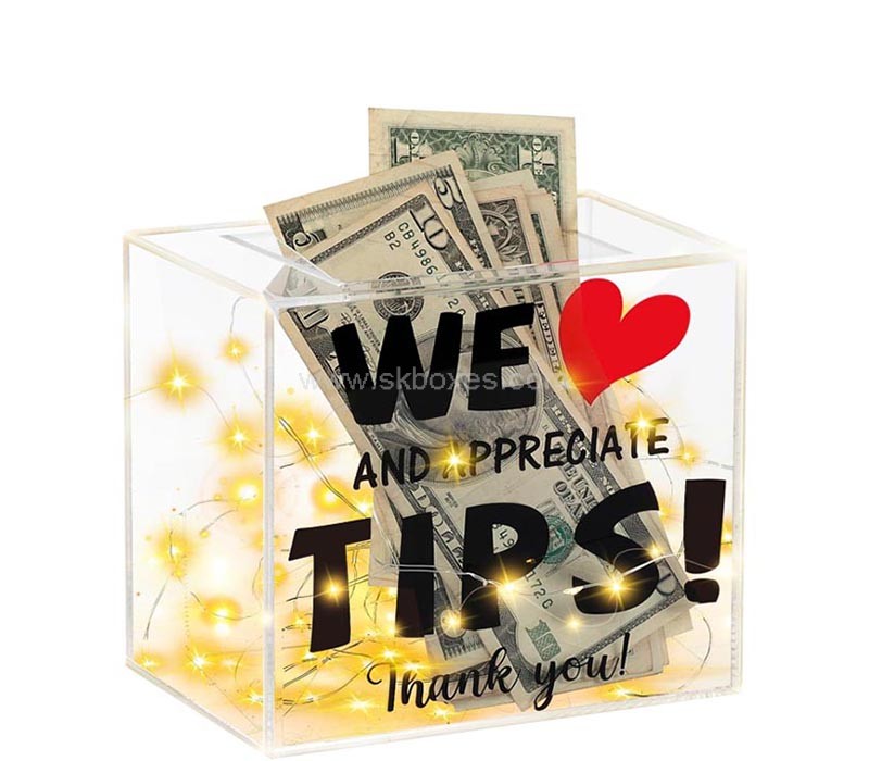 A durable wholesale custom acrylic tip box tailored for bars. Made from high-quality clear acrylic for visibility, it features an easy-access slot, secure lock, and customizable branding options. A stylish and functional solution for seamless tip collection in bar settings.