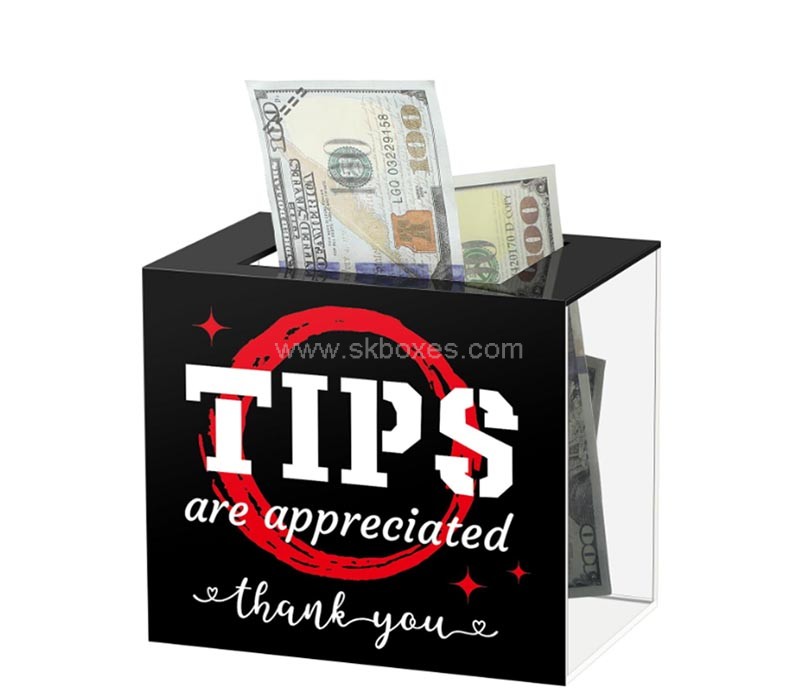 A durable wholesale custom acrylic tip box, designed for cafes, restaurants, and service counters. Made from high-quality clear acrylic for visibility, it features a secure lock, easy-access slot, and customizable branding options, combining functionality with a sleek, professional appearance.